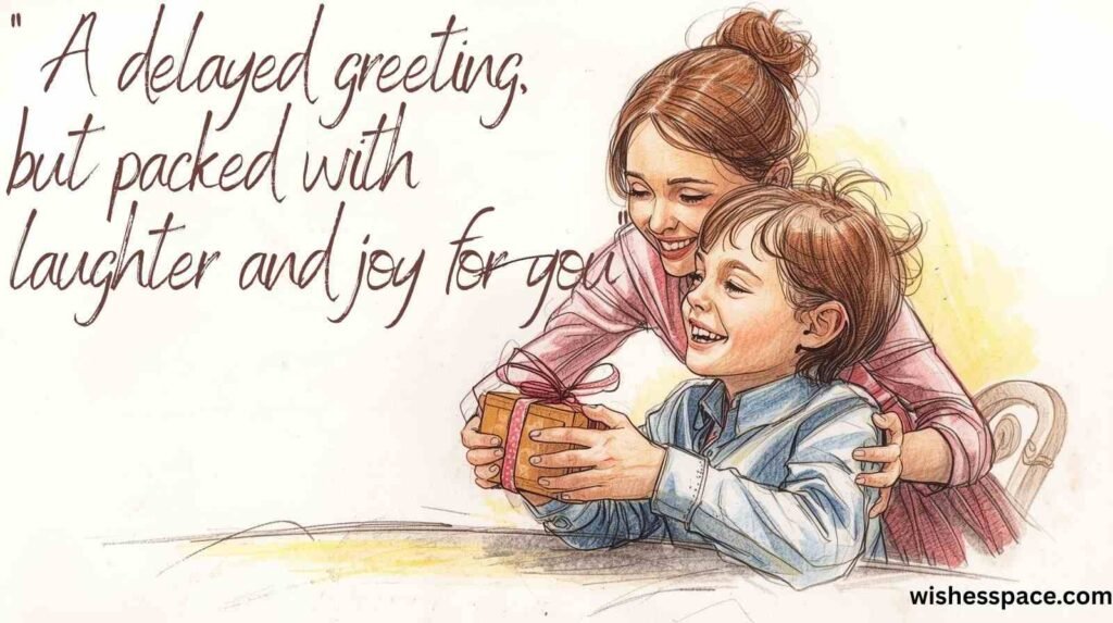 12. Though delayed, these wishes carry laughter, love, and a promise to celebrate soon.